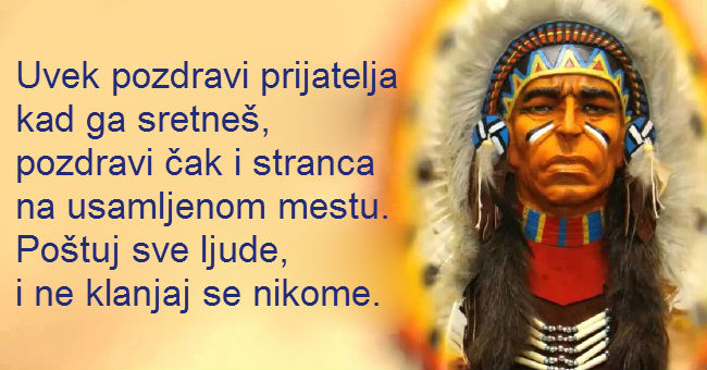 Mi nismo siromašni0. Etički kodeks sjevernoameričkih Indijanaca može nas sve inspirirati na važne promjene u razmišljanju i životu… 1. Ustanite sa suncem i pomolite se. Molite sami. Molite često. Jednom će Veliki Duh poslušati vaše molitve. 2. Budite tolerantni prema onima koji su skrenuli s puta. Neznanje, ljutnja i ljubomora dolaze od izgubljenih duša. Molite da se vrate na ispravan put. 3. Pronađite sebe. Ne dopustite da drugi upravljaju vašim putem. To je samo vaš put! Ostali mogu ići s vama, ali nitko ne može naprijed umjesto vas. 4. Budite obzirni prema gostima u svojoj kući. Poslužite im najbolju hranu, ponudite im najbolji krevet, prema njima budite pošteni i pravedni. 5. Ne uzimajte što nije vaše, bilo od ljudske zajednice, prirode ili nečije kulture. Niste to zaslužili ni dobili. Nije vaše. 6. Poštujte sve na Zemlji, kako ljude tako i životinje i biljke. 7. Poštujte mišljenja drugih, njihove želje i riječi. Nikad ne prekidajte druge dok govore, ne zamjerajte, ne rugajte im se. Svakoj osobi dopustite pravo na osobno mišljenje. 8. Nikada ne govorite loše o drugima. Negativna energija koju šaljete, a još u njoj i uživate vratit će vam se višestruko. 9. Svi ljudi griješe. Svaka pogreška se može oprostiti. 10. Negativne misli stvaraju bolest uma, tijela i duha. Vježbajte optimizam. 11. Priroda nije naša, ona je dio nas. Priroda je dio naše globalne obitelji. 12. Djeca su budućnost. Usadite im u srca ljubav, vodite ih s mudrošću i učite o životu. Kada rastu, dajte im prostora za rast. 13. Izbjegavajte povrjeđivanje srca drugih. Otrov te boli vratit će se vama. 14. Uvijek budite iskreni. 15. Održavajte svoju ravnotežu. Mentalno, duhovno, emocionalno i tjelesno “ja” moraju biti jednako snažni, čisti i zdravi. Okrijepite tijelo da bi se okrijepio um. Rastite u duhovnosti kako biste iscijelili emocionalne rane. 16. Svjesno odlučite što ćete biti i kakvi ćete biti, kako ćete djelovati i kako ćete stajati iza svojih postupaka. Budite odgovorni za svoje postupke. 17. Poštujte tuđu privatnost i osobni prostor. Ne miješajte se u tuđe vlasništvo, pogotovo ne u sveto i duhovno. To je zabranjeno. 18. Budite sigurni u sebe. Ne možete biti brižni i pomagati drugima ako niste brižni prema sebi i ako najprije ne pomognete sebi. 19. Poštujte tuđa vjerska uvjerenja. Ne prisiljavajte druge da vjeruju u vaša. 20. Dijelite svoju sreću. imamo sve šta nam treba, a iz prirode uzimamo samo koliko nam je dovoljno.